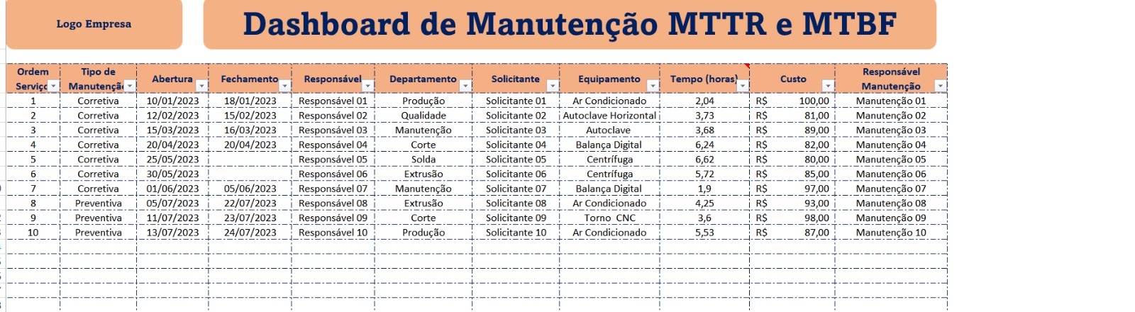 *Equipamentos; Total de OS; OS Pendente e Custo total