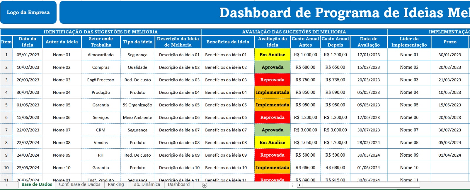 Trabalhamos com as melhores Dashboards do mercado, temos dashboards na área da Qualidade, Segurança do Trabalho , BPF e etc , também temos kits de implantação ISO 9001,14001,45001 e BPF .Todos os kits ou planilhas serão entregue via e-mail com pasta compactada.