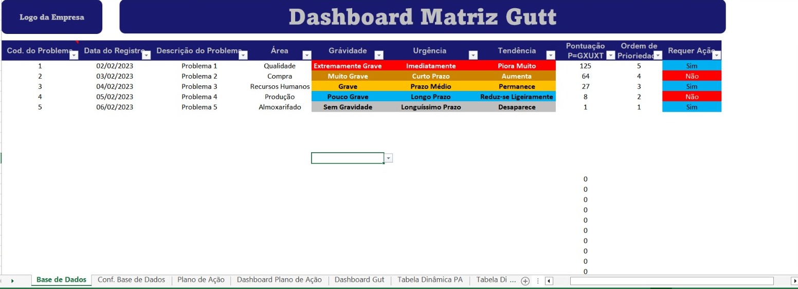Gráfico Gutt: Quantidades de Sim e Não de Problemas; % Ações e Total de Ações por Área